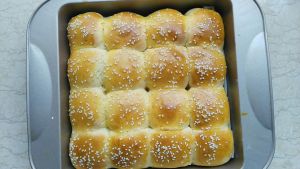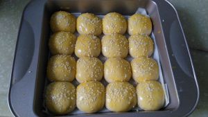 面包表面刷一层全蛋液,撒适量白芝麻。烤箱180度预热,烤盘放置中层,上下火烤20分钟左右。