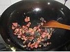 坐锅热油,放香菇丁、皮蛋丁、香肠丁煸炒一下