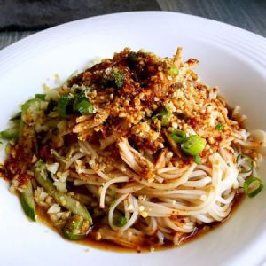 把调味汁,黄瓜丝,鸡丝,花生碎一起拌入过好水的面里!一碗美味的凉拌鸡丝完成了!