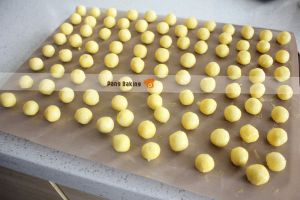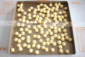 将椰丝球放入烤盘中,上火200,下火150,烤10-15分钟,烤时注意表面颜色,防止上色过度(烘烤时间和温度仅供参考,具体根据自已的烤箱情况来设置)