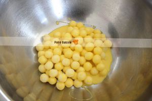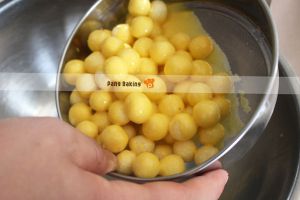将表面已冻硬的椰丝球取出,放入拌好的蛋黄奶油液中,稍稍拌一下,使椰丝球都可以上色