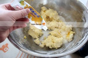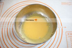 将鸡蛋液、芒果果酱加入,混合拌匀