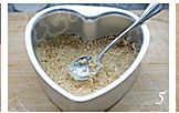 趁冷藏的时间,将黄油入微波炉转20秒至溶化,将饼干装入塑料袋中用擀面杖碾碎,倒入黄油碗中,搅拌均匀后铺入心型模具中,并用勺背压平;