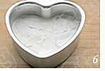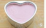 将冰箱内的慕斯糊取出,用像皮刮刀分出一半的分量刮入心型模内,墩平表面,将模具放入冰箱冷藏;