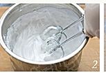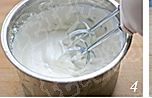 盆中倒入125克鲜奶油用电动打蛋器以高速打至七分发,即打蛋器旋转过后纹路不消失的状态即可;