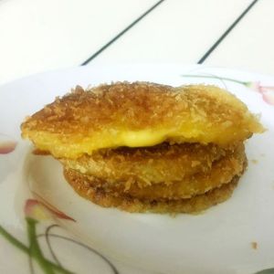 南瓜,芝士片,糯米粉,面包糠。我没有放糖,喜欢甜的可以自行添加哈。