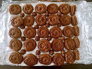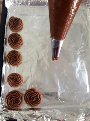 把面糊装入裱花袋,用喜欢的花嘴在烤盘上挤出花纹