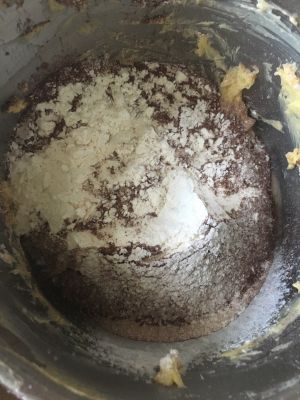 筛入可可粉和低筋面粉,用橡皮刮刀搅拌至无干粉状态即可,不要过度搅拌