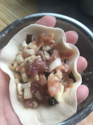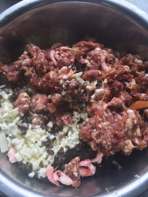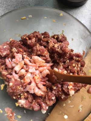 把肉馅家葱姜末,味极鲜,料酒,和切碎的虾仁,拌匀养肉馅入味。