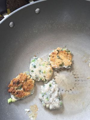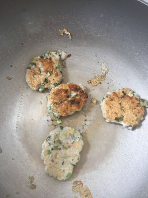 下油,等锅有烟后就把鲮鱼肉弄好一小坨放入锅