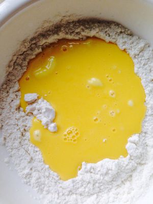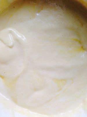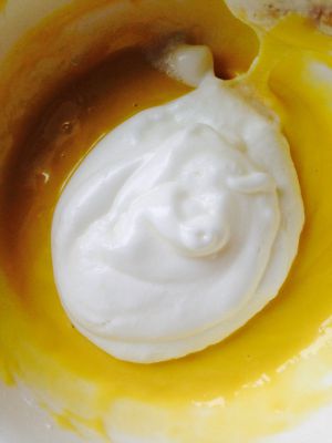 取1/2蛋白加入蛋黄面粉混合液,用切拌的方式搅拌,不要转圈搅拌防止蛋白消泡