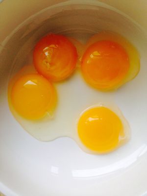 打四个蛋分离蛋黄。蛋清盛在无水无油的盆里,这是蛋清打发的保障哦