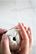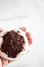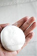 一手拖着面团,另一只手从四周向上推至面团包住豆沙馅;
