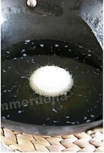 用手揪一小块面团,压扁,用勺子盛入适量豆沙馅;