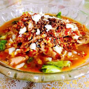 将煮熟的里脊肉捞出放在生菜上,浇上汤汁,放花椒碎和辣椒碎,撒上蒜末。淋上少许热油即可。