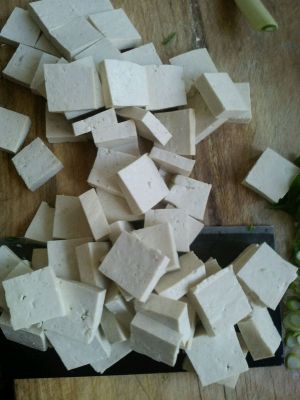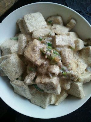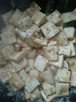 倒油,油热了,放葱蒜,放虾酱,虾酱搅匀,放豆腐,盐淡加点盐。