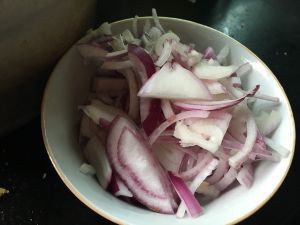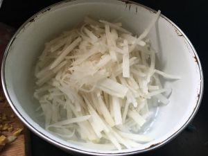 洋葱切细丝,我切的还不够。也可以切成粒,也可以不加洋葱。