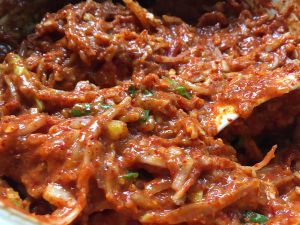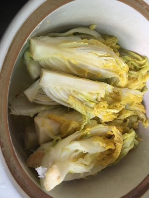 大白菜层层放盐,腌制出水,沥干,将盐分清洗干净,水沥干