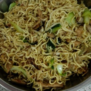锅中下油把瘦肉炒八分熟,下鱿鱼干香菇一起炒,炒熟下酱油,起锅,记得可以放多点油,炒面时就不用下油炒噢,再把青菜豆芽下锅炒,放盐,鸡粉,炒半成熟下面炒加瘦肉香菇料一起翻炒,记得开小火,不然沾锅,再下蚝油炒一下就可以出锅了