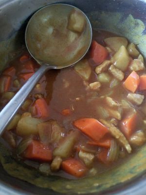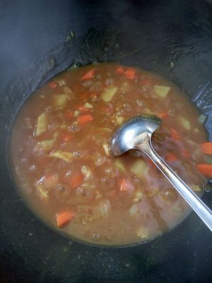 这时候关火放入咖喱料使其融化后再开火收汁现在可以试试咸淡了,淡了加适量盐