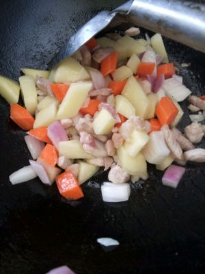 净锅放油烧热下入除咖喱料的所有材料炒香