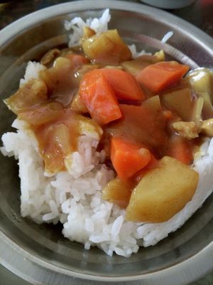 成品自己吃没整形! 要整形的话可以用小碗盛满饭压实倒扣在大点的盘子上揭开浇上咖喱酱就OK了