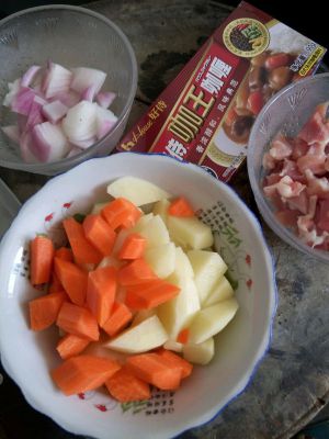 准备好所有材料 鸡腿去骨切丁 土豆胡萝卜去皮切丁 洋葱切碎