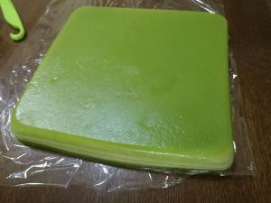 蒸好后把盘子拿出来放凉,可以放冰箱也可以不放,切前倒扣在保鲜纸上,尽量用锋利的刀来切,这样子会切的好看些,我家的刀不好用,好不容易才切出这个样子。