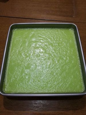 把一个方型盘架在锅里,放入大量水大火烧开,把量好的200g绿色面浆倒入盘里,用勺子把面浆平摊在盘子上,在盘子上盖一张锡纸,盖上锅盖大火蒸4~5分钟。接着倒入白色面浆继续大火蒸4~5分钟,依次倒入不同颜色面浆,最后一次一定是绿色的,而且蒸久一点8~10分钟,把里面的面浆都蒸熟。要尽量选择方型的容器,做好后切开比较好看。