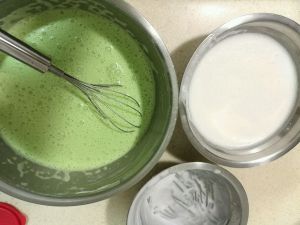 按照预算要做的层数来分面浆,由于这次偷懒不做9层,做7层,面浆的总重量是1400g,每层的量是200g,所以面浆分成600g和800g。把班兰汁加入份量大的面浆里,加入的量自己定,调到自己满意的颜色。没有新鲜的班兰汁也可以用班兰精油代替。