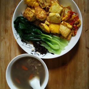 大约三分钟,豆腐出锅,加水清煮上海青,一分钟后捞出摆盘,配上一勺黄豆酱。再来一碗莲子百合八宝粥,秋天滋阴润肺,完美。