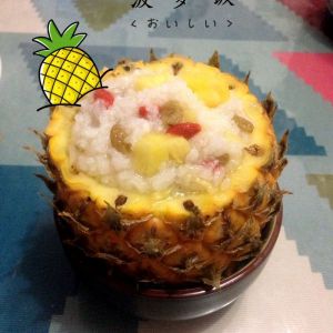 糯米提前泡四小时左右,蒸熟,或者用电饭煲煮熟,一定记得水不要太多,趁热将糯米、葡萄干、枸杞、敲碎的冰糖混合装入菠萝碗