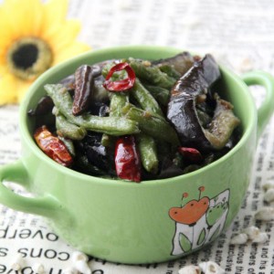 锅内放油,约7成热时放入豆角炸至表面起白色小泡后捞出沥干油,将茄子条放入油锅中,炸制金黄后捞出沥油