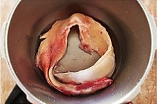 高压锅里加水放花椒大料和少许盐,牛板筋切成大段,上火压半小时。