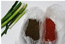 准备一把青蒜,还有一袋麻椒末和一袋辣椒末。这两袋东西我都稀罕的了不得,麻椒是珍豆给我的,辣椒是董老师给我的,炸出来的油可香呢。