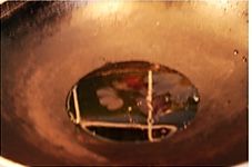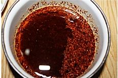 油烧热后关火,然后数10秒,再把热油浇到小碗里。为什么要停留十秒呢,就是怕油太热把辣椒末炸糊了,那样就不香了。
