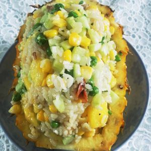 煮好糯米饭,放凉后加入准备的玉米粒、雪豆,菠萝炒饭