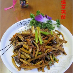 坐锅热油,放入茶树菇煸炒,加少许料酒