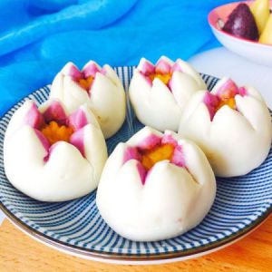 将南瓜和紫薯洗净削皮,切成小块或薄片,放蒸锅蒸熟(大约十二分钟),紫薯放至微温(约35度左右)加入2克酵母粉,再加200克面粉,如还干就加适量水搅拌成雪花状,与白面团相同,揉成光滑的紫色面团。
