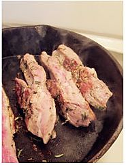 铸铁锅大火加热至冒烟的状态,加入羊排大火煎,每面各需大约2-3分钟至焦黄的状态,当开始煎的时候不要急着翻面,耐心的等待羊排才会煎得焦黄诱人哦。当然这个时间也和羊排的厚度有关,总之时间是个概数,观察煎出的状态即可。因为我买的羊排比较厚,所以侧面也要煎一煎