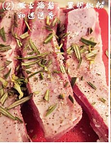 羊排两面依次重复撒适量海盐,黑胡椒粉,切碎的迷迭香,再加上橄榄油涂抹均匀的动作。