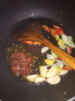 热锅倒油,放入葱姜蒜、辣椒炝锅,再放入一勺豆瓣酱