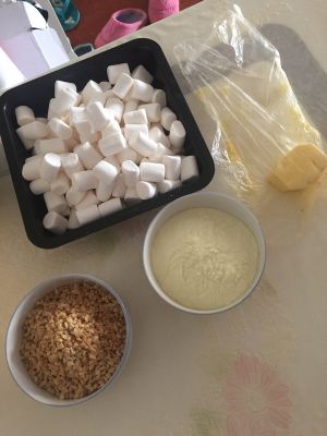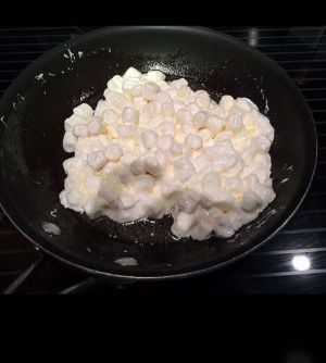 黄油放入不粘锅内融化成液体,然后倒入棉花糖,搅拌到棉花糖都软化了