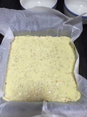棉花糖融化后倒入奶粉,搅拌均匀后,再倒入花生碎进行搅拌,翻炒至均匀融合,底部垫上油纸(是为了冷却后方便脱落下来)。