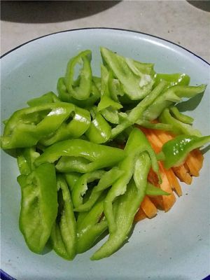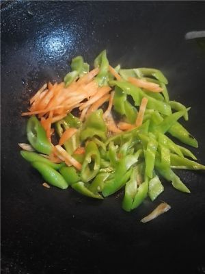 锅内加入油,翻炒青椒胡萝卜丝,炒到五分熟