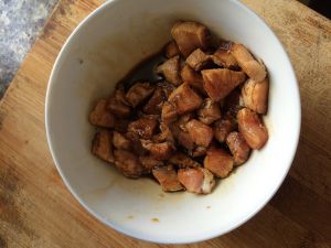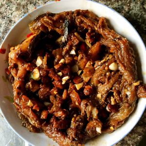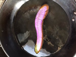 把前面烫软的茄子刨开,里外刷油后,用锅中剩油小火,注意是小火哦,在铁锅中煎茄子。边煎边用菜铲压压,茄子吃油八分左右后,在上面浇白酒,陈醋,香油,酱油各一菜铲。焖煮一会后下肉丁,盐,蒜末翻炒后起锅。