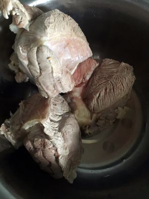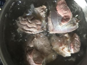将牛肉洗干净,冷水下锅,煮开,开锅后开始打血沫,一定要打干净,越干净越好哦。