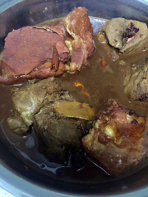 时间到,出锅啦。出锅后最好用汤汁泡一夜,会比较入味。因为全程没有➕酱油,所以做出来的颜色是酱色,但是红色的那块,是加了红曲米的效果。所以,依自己的喜好选择是否添加红曲米即可。
