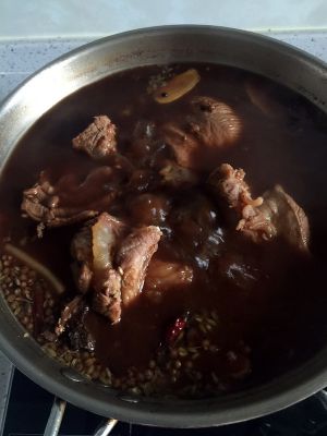 加入红曲米和冰糖。再煮20分钟。后面会说作用哦。用筷子扎一下是否能扎透,扎透了就熟了,喜欢吃烂一些的可以多煮。煮到汤稍粘稠的状态最好。