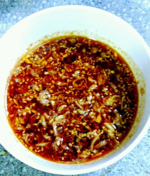 炸好葱头的油不用再加热了,立马放两勺四川辣椒面和熟白芝麻搅拌